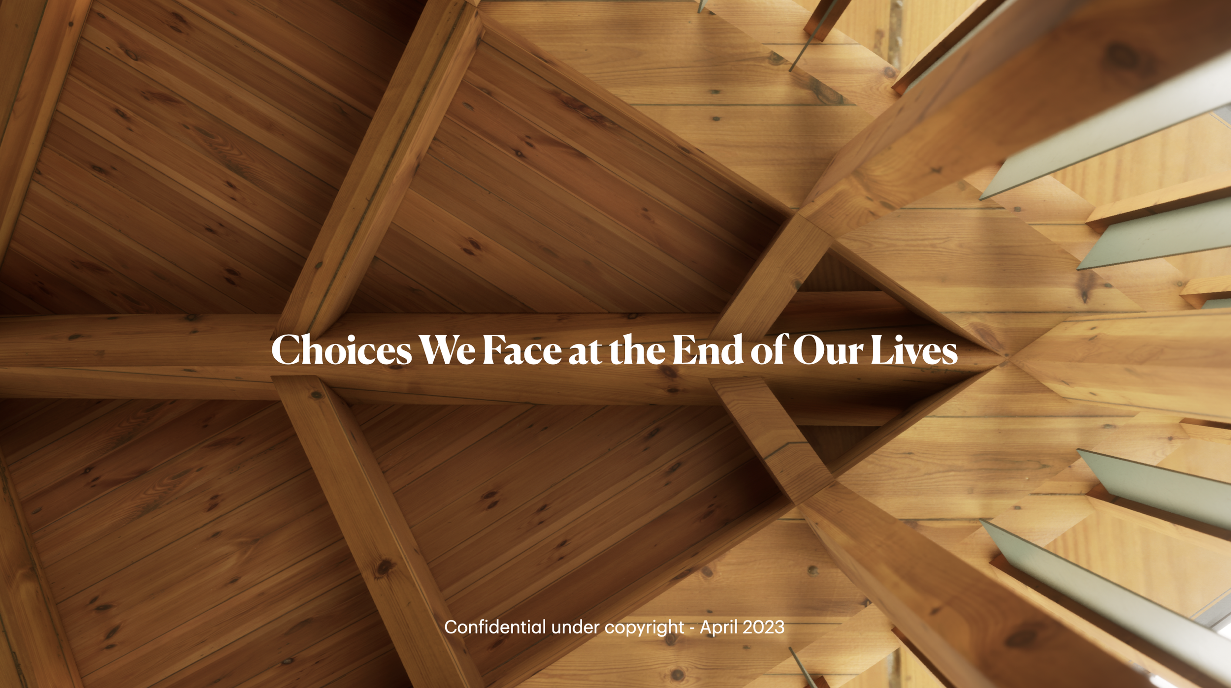 A study for bettering the end-of-life experiences. We face both a challenge and opportunity: creating new approaches to building community, cultivating spirituality, and practicing ritual. This work is about everything that comes before and after.